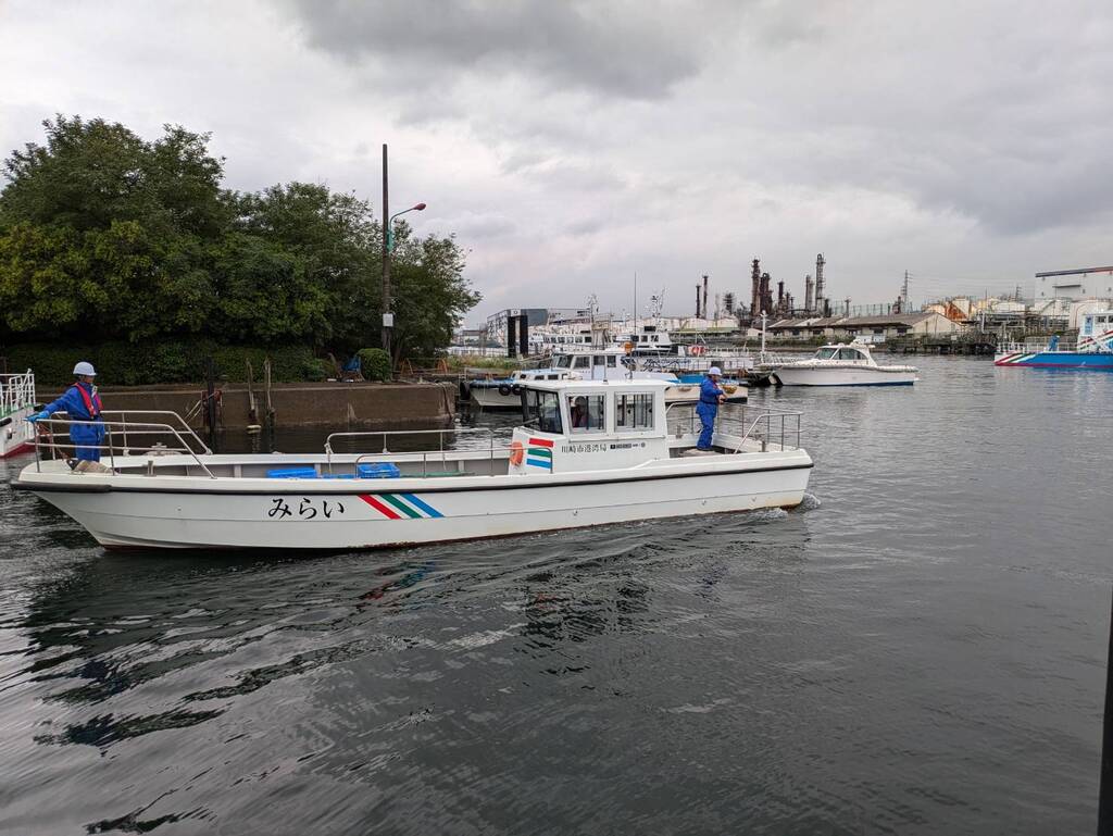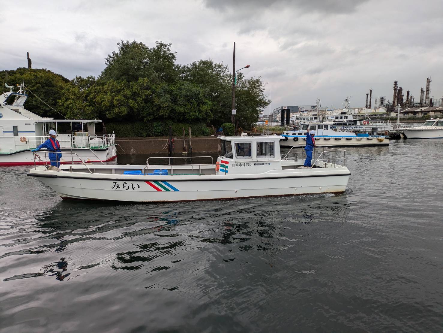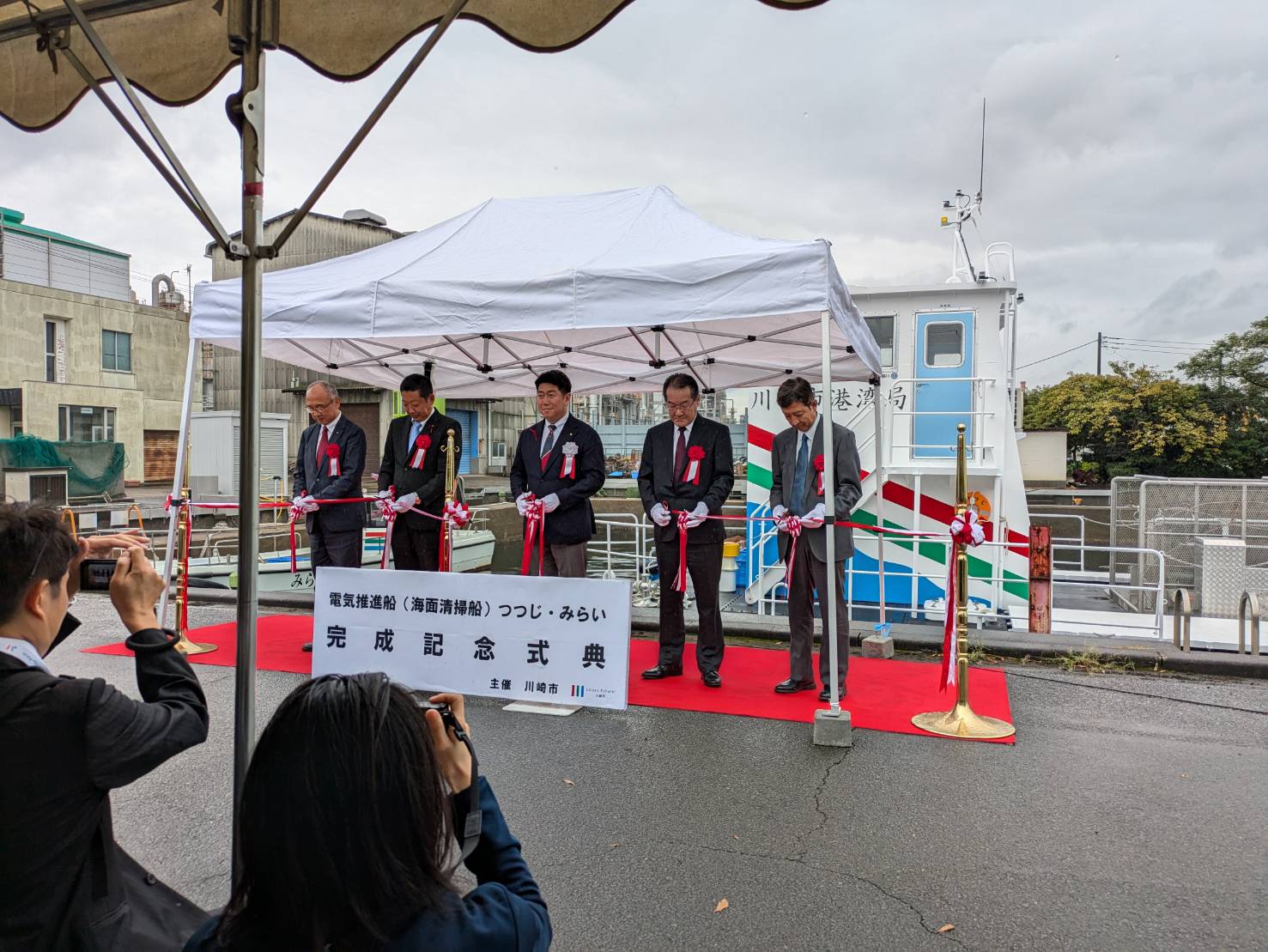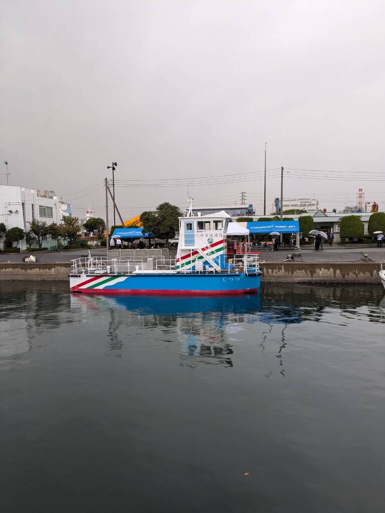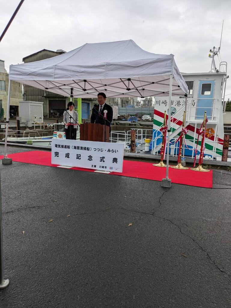 昨日川崎市電動推進船の完成記念お披露目会が開催されました。2025年10月5日お知らせ by k.kudo.弊社が納めましたEVシステム小型清掃船みらい号&他社が納めた大型清掃船つつじ号の完成記念お披露目会が小雨の中川崎市千鳥町で行われました。川崎市長・川崎市議会議長のご挨拶、テープカット、その後デモ走行・お客様の試乗・船体見学会が行われ多くの方が電動推進船の音の静かさにびっくりされていました。ご覧ください。前の記事